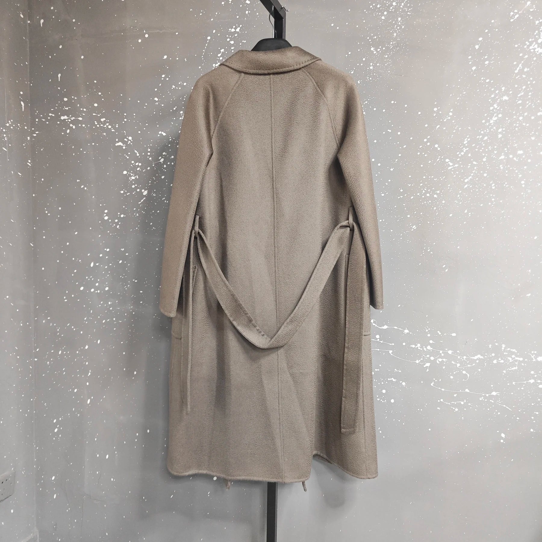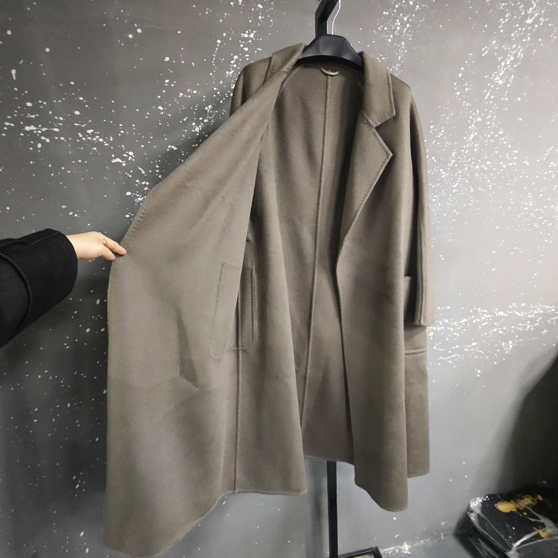 • Signature Water Ripple Texture: The fabric features a unique "water ripple" or "corrugated" texture, giving it a sophisticated, dynamic sheen and an exceptionally soft, delicate velvet-like feel. This texture is a hallmark of high-end wool and cashmere outerwear.