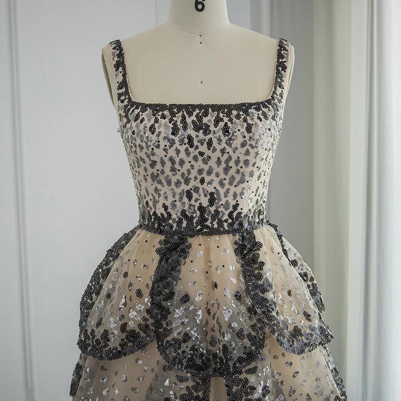 • Luxury Details: The dress is richly decorated with Sequined accents throughout the tiered ruffles, adding a touch of undeniable luxury.
