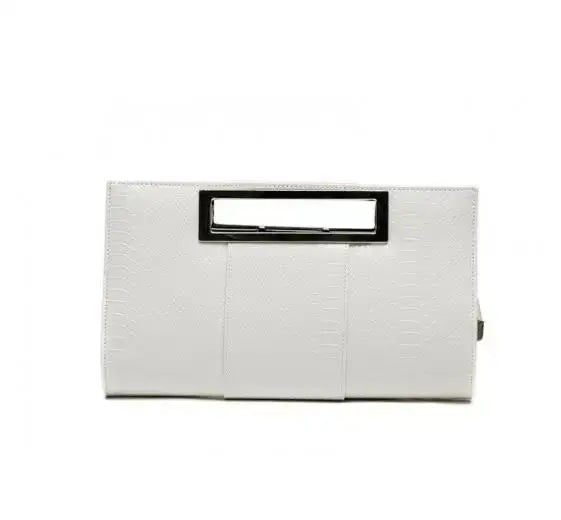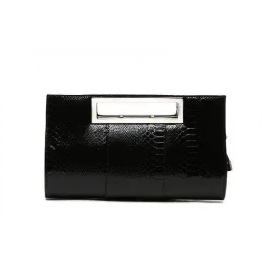 • The Clutch: A sleek, rectangular clutch bag in the same deep red, glossy crocodile-embossed finish, featuring a stylish silver-tone metal bar handle.