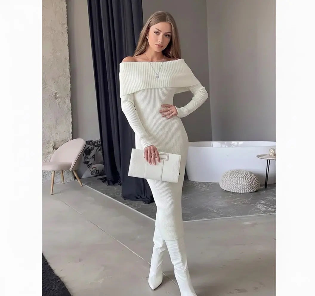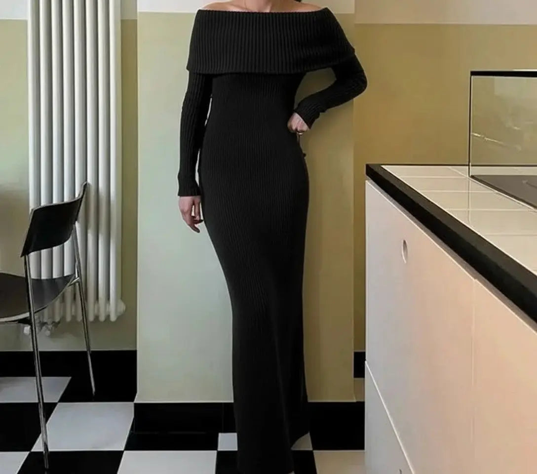 • The Dress: A striking maxi-length, off-the-shoulder knit dress in a deep, cranberry-red hue.