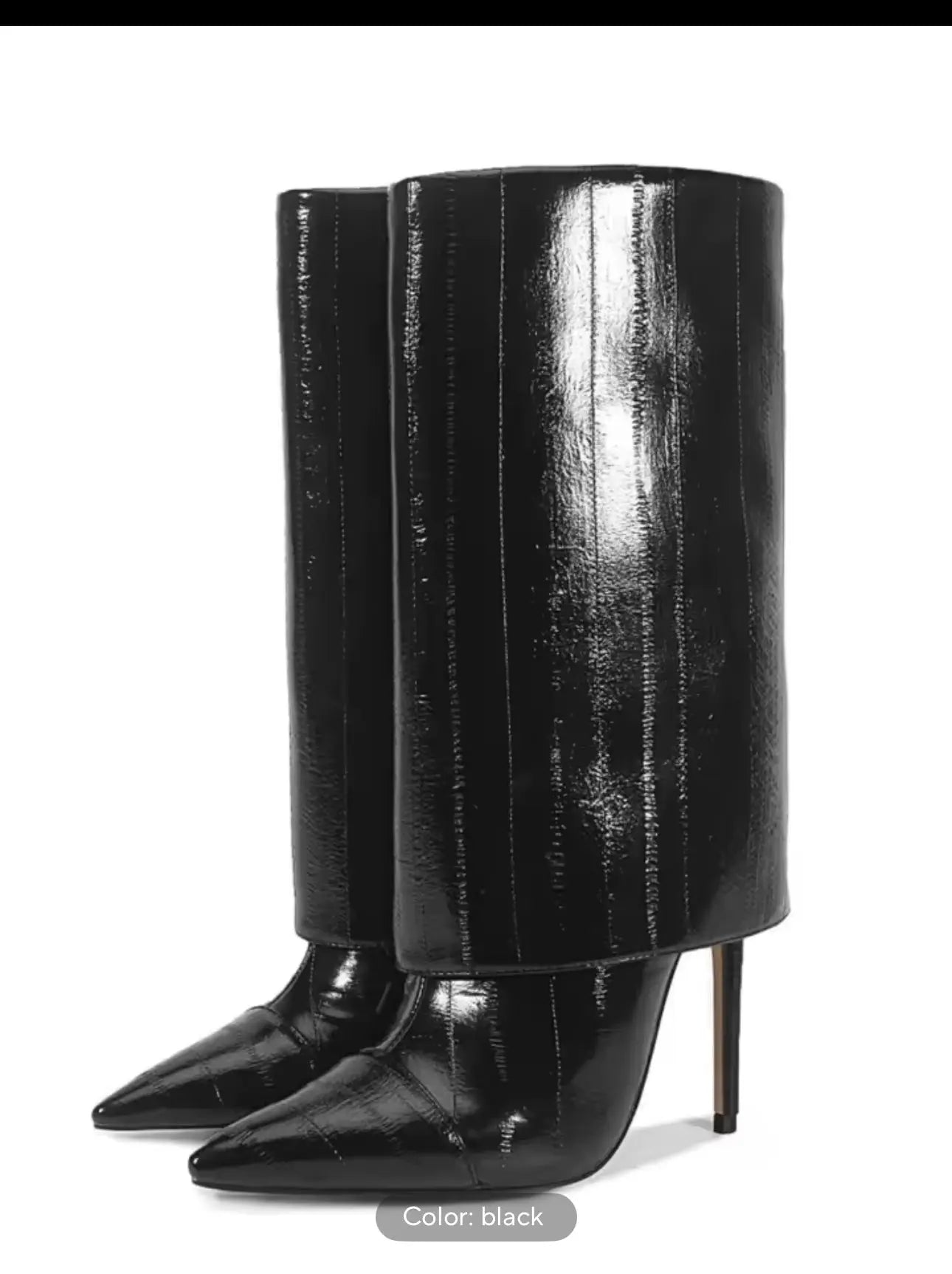 • Style: Slouchy shaft and a sharp, pointed toe, mounted on sleek stiletto heels.